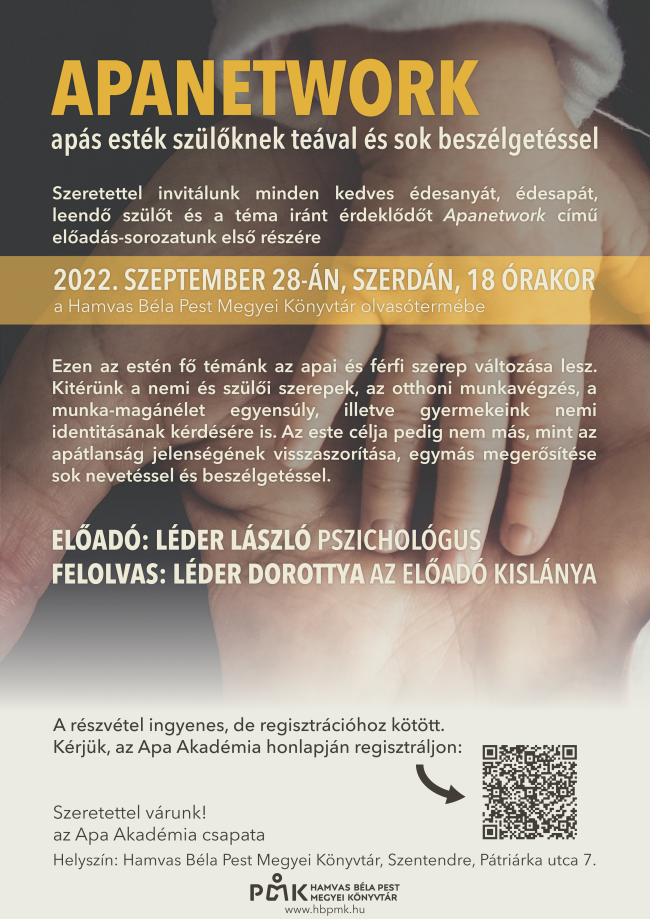 Szeretettel invitálunk minden kedves édesanyát, édesapát, leendő szülőt és a téma iránt érdeklődőt Apanetwork című előadás-sorozatunk első részére: