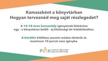 Kérdőív - 14-18 éves korosztály igényeinek felmérése Kamaszként a könyvtárban - hogyan terveznéd meg saját részlegedet? A 14-18 éves korosztály igényeinek felmérése egy - a könyvtáron belüli - új közösségi tér kialakításához. A kérdőív kitöltése anonim módon történik és maximum 10 percet vesz igénybe. Tovább (Kérdőív - 14-18 éves korosztály igényeinek felmérése)