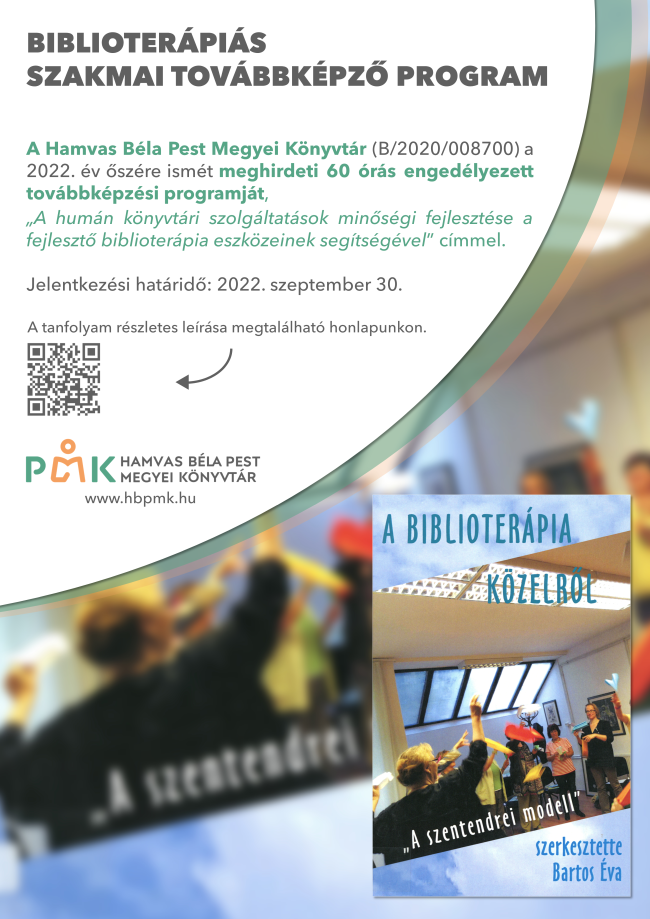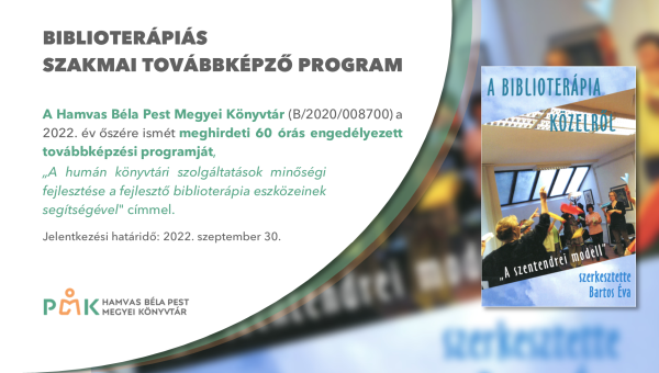 A Hamvas Béla Pest Megyei Könyvtár a 2022. év őszére ismét meghirdeti 60 órás engedélyezett továbbképzési programját, „A humán könyvtári szolgáltatások minőségi fejlesztése a fejlesztő biblioterápia eszközeinek segítségével” (B/2020/008700) címmel.
