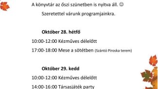 A könyvtár az őszi szünetben is nyitva áll. Szeretettel várunk programjainkra.
