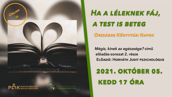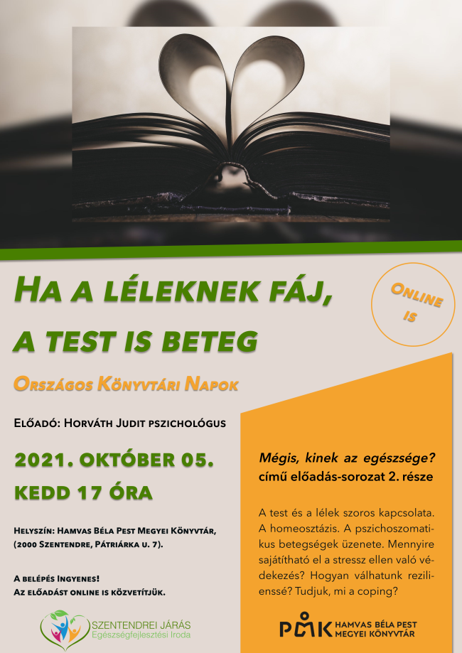 Mégis, kinek az egészsége? című előadás-sorozatunk második alkalmán Horváth Judit, pszichológus a test és lélek kapcsolatáról tart előadást.
