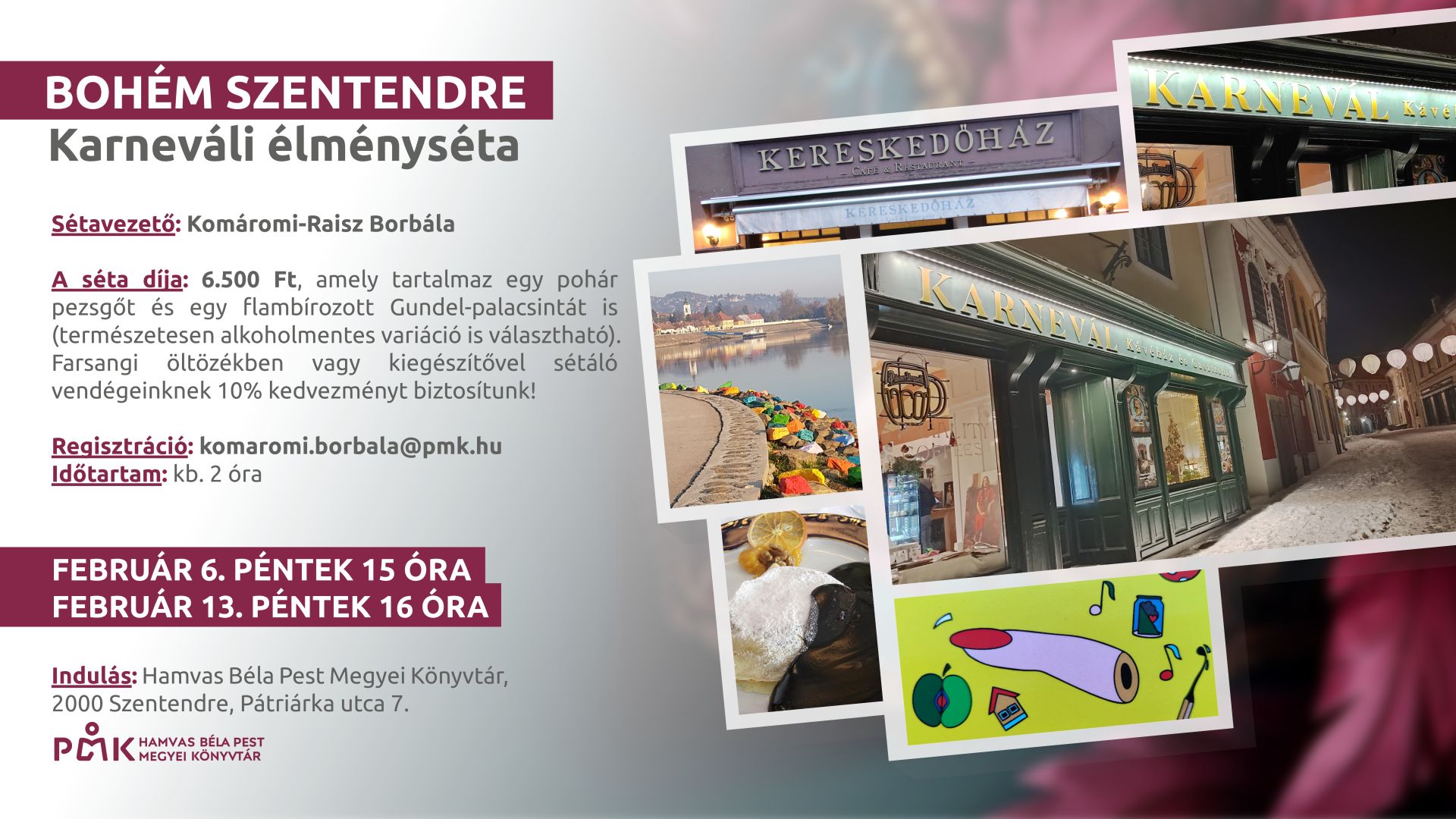 Ezen a különleges alkalmon helytörténeti érdekességeket tudhatunk meg városunk "karneváli" vonatkozásairól és bohém oldaláról. Amire számíthatunk: irodalom, képzőművészet, zene, gasztronómia... egy élménydús délután során.