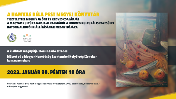 A Hamvas Béla Pest Megyei Könyvtár tisztelettel meghívja Önt és kedves családját a magyar kultúra napja alkalmából a Honvéd Kulturális Egyesület katona alkotói kiállításának megnyitójára.