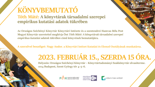 Az Országos Széchényi Könyvtár Könyvtári Intézete és a szentendrei Hamvas Béla Pest Megyei Könyvtár szeretettel meghívja Önt Tóth Máté: A könyvtárak társadalmi szerepei empirikus kutatási adatok tükrében című könyvének bemutatójára.