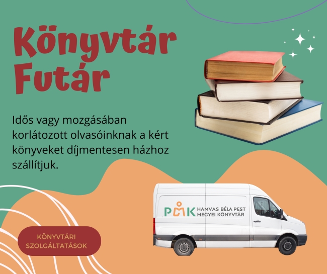 Könyvtárfutár szolgáltatással szeretnénk kedveskedni idős (70 év feletti) és mozgásukban korlátozott szentendrei olvasóinknak és kérésre házhoz szállítjuk a kölcsönözni kívánt könyveket, DVD -ket, CD -ket.