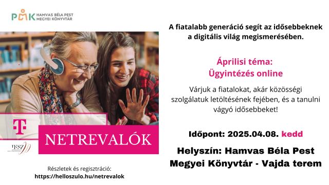 Dátum 2025.04.08. - 15:00 A fiatalabb generáció segít az idősebbeknek a digitális világ megismerésében.Áprilisi téma: ügyintézés onlineVárjuk a a fiatalokat, akár közösségi szolgálatuk letöltésének fejében, és a tanulni vágyó idősebbeket.