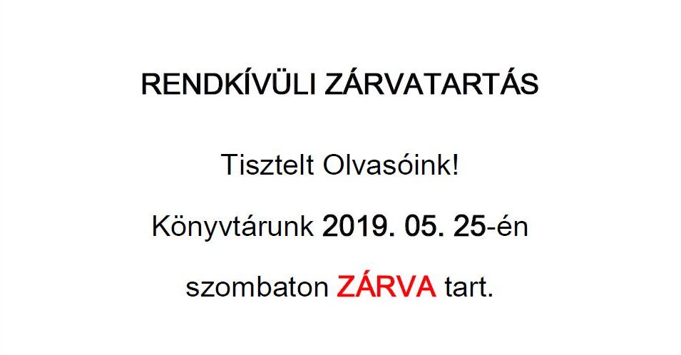 Könyvtárunk 2019.05.25-én szombaton ZÁRVA tart.
