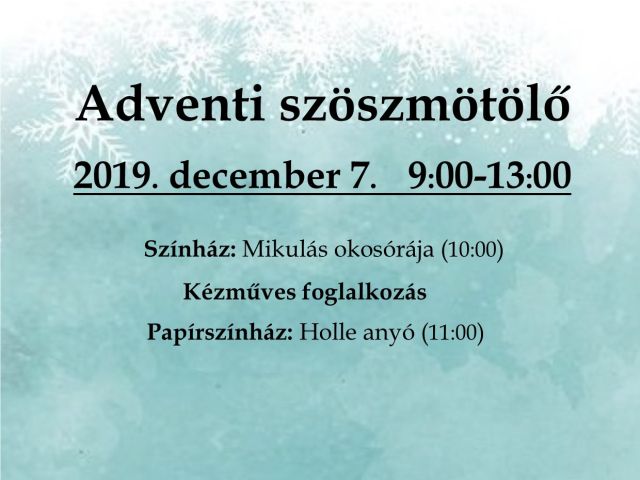 Dátum 2019.12.07. - 09:00 Adventi szöszmötölő 10:00 színház: Mikulás okosórája Kézműves foglalkozás 11:00 papírszínház: Holle anyó Helyszín: Hamvas Béla Pest Megyei Könyvtár (Szentendre, Pátriárka utca 7.) A belépés ingyenes!