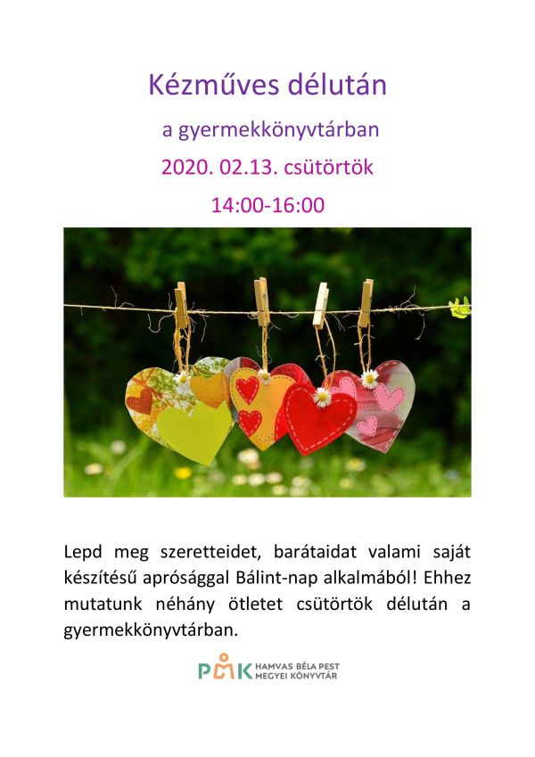 Lepd meg szeretteidet, barátaidat valami saját készítésű aprósággal Bálint-nap alkalmából! Ehhez mutatunk néhány ötletet csütörtök délután a gyermekkönyvtárban.