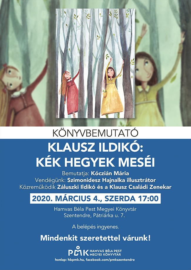Dátum 2020.03.04. - 17:00 Könyvbemutató Bemutatja: Kóczián Mária Vendégünk: Szimonidesz Hajnalka illusztrátor Közreműködik: Záluszki Ildikó és a Klausz Családi Zenekrar Helyszín: Hamvas Béla Pest Megyei Könyvtár (Szentendre, Pátriárka utca 7.). A belépés ingyenes!