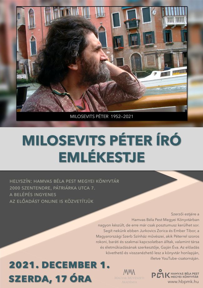 Segít nekünk ebben Jurkovics Zorica és Ember Tibor, a Magyarországi Szerb Színház művészei, akik Péterrel szoros rokoni, baráti és szakmai kapcsolatban álltak, valamint társa és életműkiadásának szerkesztője, Gaján Éva. Az előadás követhető és visszanézhető lesz a könyvtár honlapján, illetve YouTube-csatornáján.