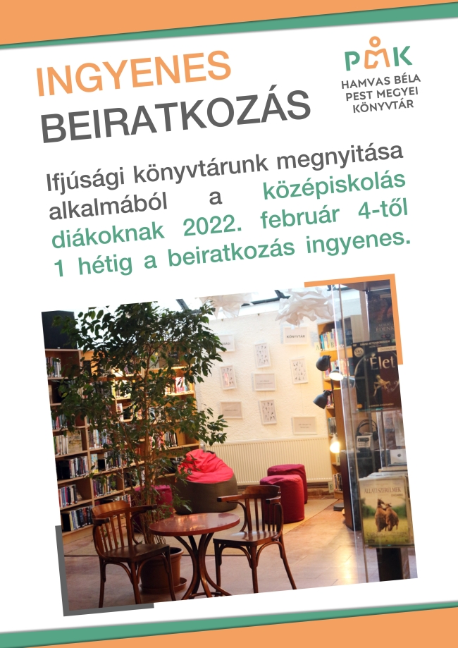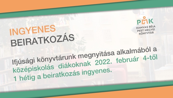 Dátum 2022.02.04. - 09:00 Ifjúsági könyvtárunk megnyitása alkalmából a középiskolás diákoknak 2022. február 4-től 1 hétig a beiratkozás ingyenes.