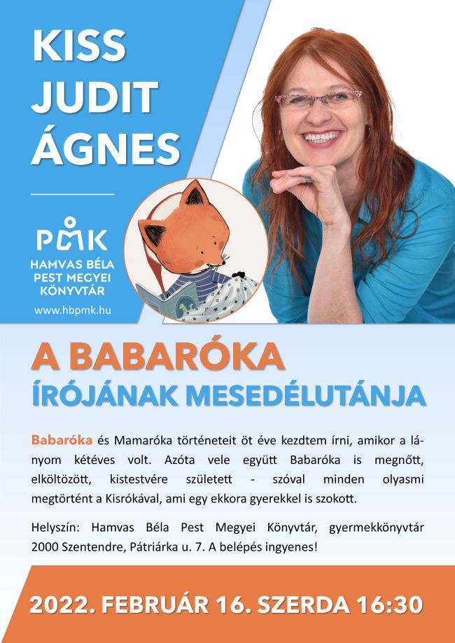 Nagy örömünkre februárban Kiss Judit Ágnes lesz a gyermekkönyvtár vendége. Az írónőnek többek között olyan nagyszerű gyerekkönyveket köszönhetünk, mint a kedves Babaróka sorozat, A tündérkeresztanya vagy az '56-os forradalomról szóló lebilincselő ifjúsági regény, a Kórház az osztályteremben. Gyertek és találkozzatok vele, ismerjétek meg könyvtárunkban fellelhető könyveit, kérdezzétek a készülőben lévő köteteiről!