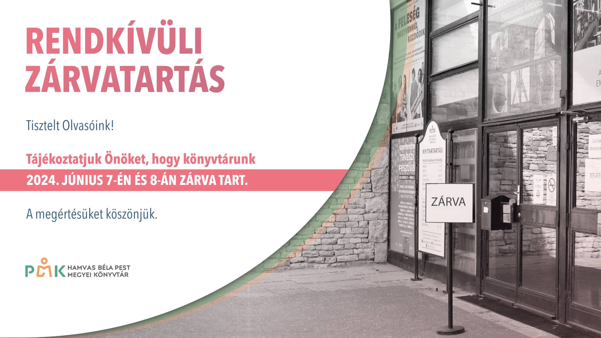 Tisztelt Olvasóink! Tájékoztatjuk Önöket, hogy könyvtárunk 2024. június 7-én és 8-án zárva tart.A megértésüket köszönjük.