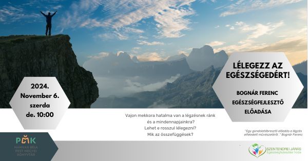 Dátum 2024.11.06. - 10:00 Bognár Ferenc egészségfejlesztő előadásaVajon mekkora hatalma van a légzésnek ránk és a mindennapjainkra?Lehet-e rosszul lélegezni?Mik az összefüggések?