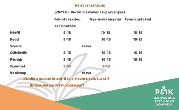 Így lehetőségük van a korábban kölcsönzött könyvek visszahozatalára. Egyúttal felhívjuk figyelmüket, hogy május 13-tól ismét felszámoljuk a késedelmi díjakat. Kérjük, kísérjék figyelemmel módosított nyitvatartásunkat, és mindannyiunk egészségének megóvása érdekében tartsák be az ideiglenes könyvtárhasználati szabályokat!