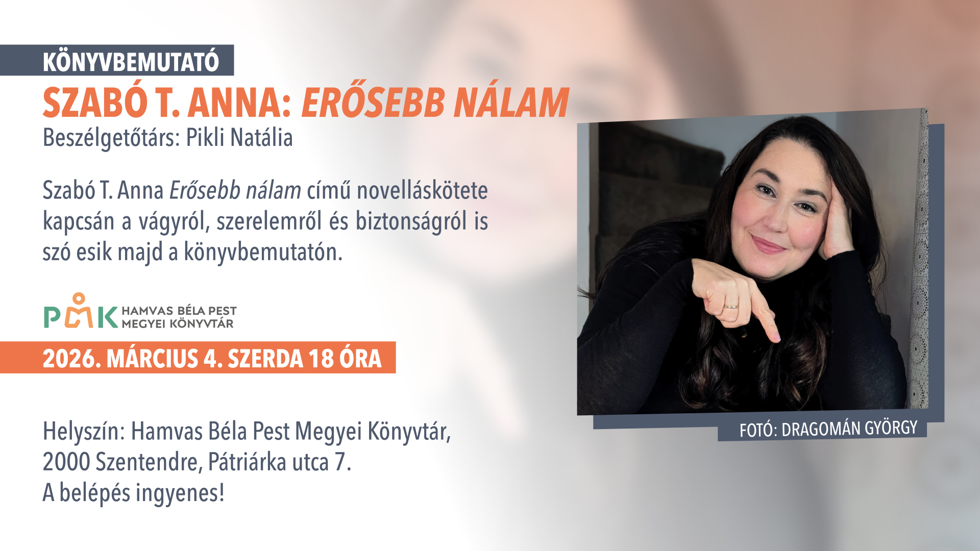 Szabó T. Anna Erősebb nálam című novelláskötete kapcsán a vágyról, szerelemről és biztonságról is szó esik majd a könyvbemutatón.
