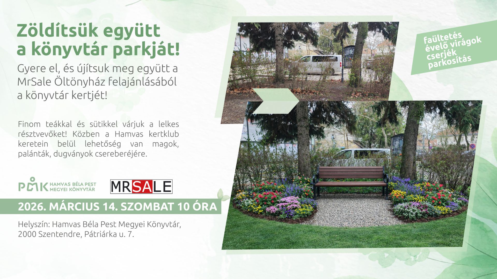 Gyere el, és újítsuk meg együtt a MrSale Öltönyüzlet felajánlásából a könyvtár kertjét! Finom teákkal és sütikkel várjuk a lelkes résztvevőket!